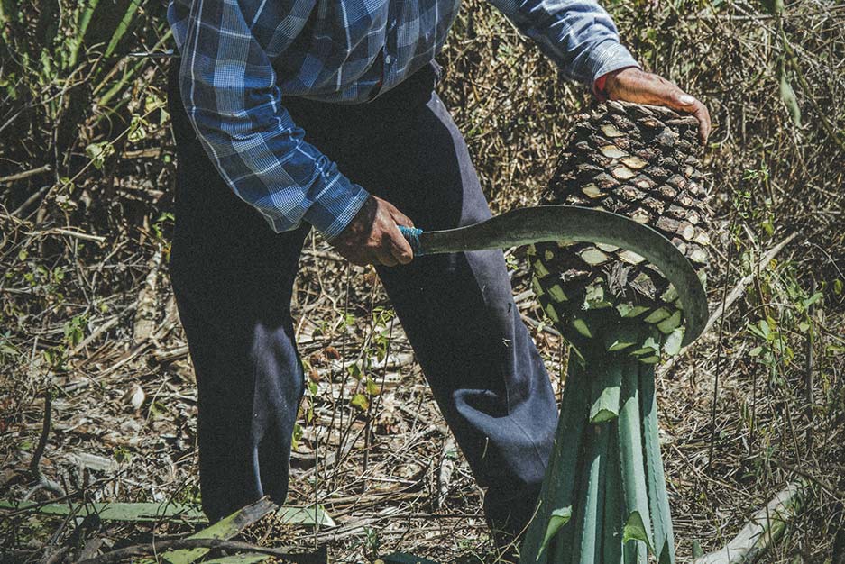 Al llegar al punto exacto de madurez, esto es cuando el agave contiene los azúcares y nutrientes necesarios —lo que puede presentarse entre los seis y nueve años para el espadín y de 15 a 18 años en el caso del cupreata—, cosechamos nuestras plantas de la tierra que las arropó por lustros y las rapamos cuidadosamente con machete, al final de este proceso sólo quedan las piñas o corazones para ser trasladados a la fábrica.