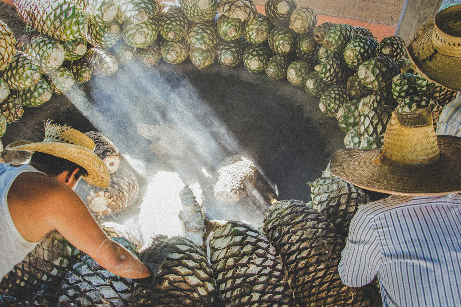 Ya en la fábrica, las piñas se cuecen lentamente en un horno cónico de piedra de tezontle aproximadamente por dos días, para esa cocción se utiliza únicamente leña de recolección de huaje, tepehuaje, huamúchil y cedro enebro; esto implica que no talemos un solo árbol en nuestro proceso. Al terminar la cocción, se dejan reposar y enfriar lentamente los agaves cocidos durante un día para posteriormente desgarrarlos y molerlos. Así obtenemos una fibra conocida como mosto.