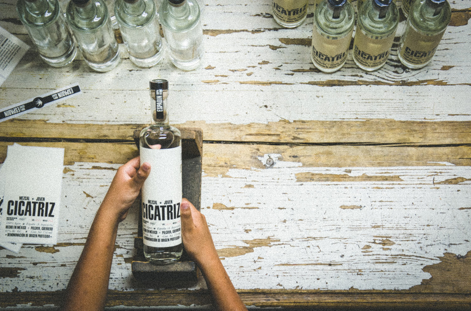 Finalmente cada botella de mezcal Cicatriz es envasada y etiquetada a mano para poder disfrutarse.